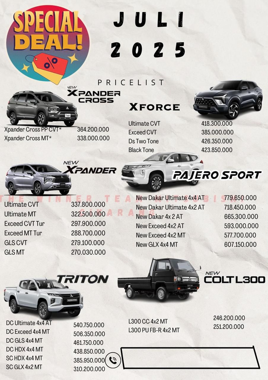 Percayakan perjalanan Anda kepada kami. Hubungi Sales Mobil Mitsubishi Bekasi di nomor kontak di bawah ini, dan biarkan kami membawa Anda lebih dekat ke perjalanan yang telah Anda impikan.